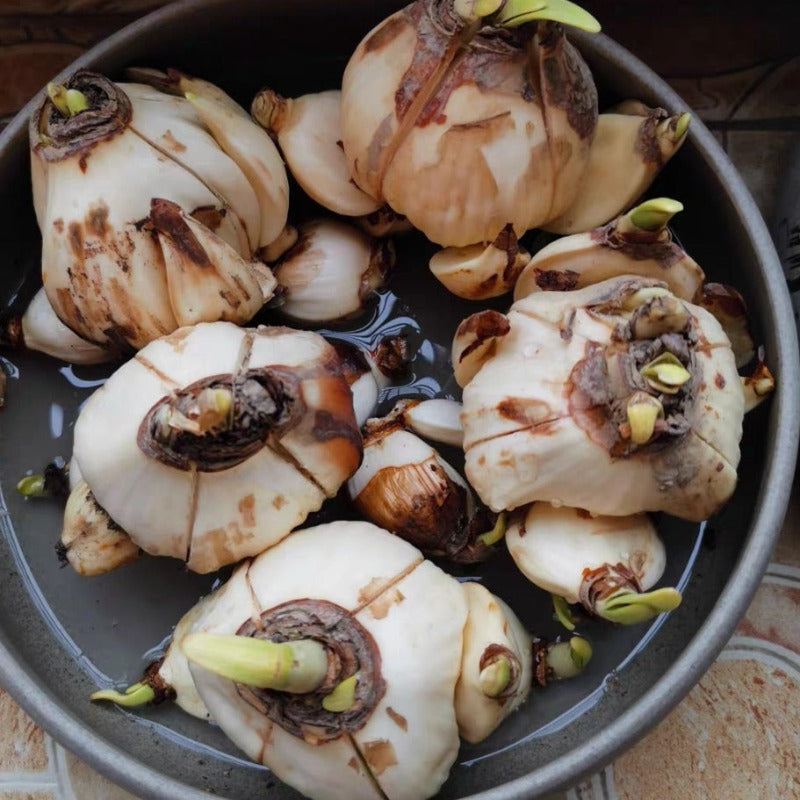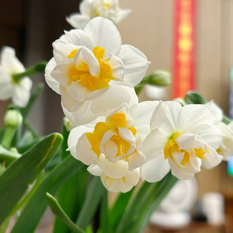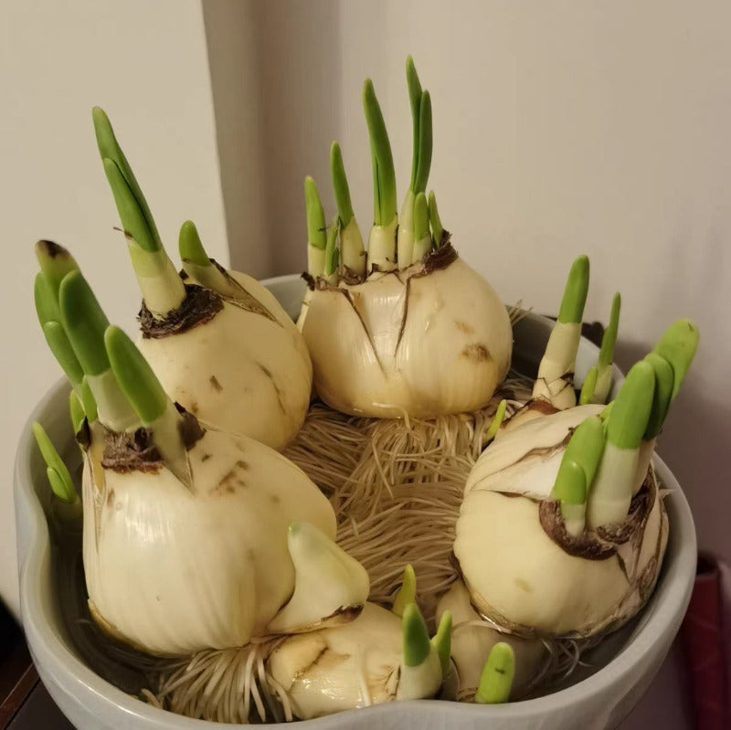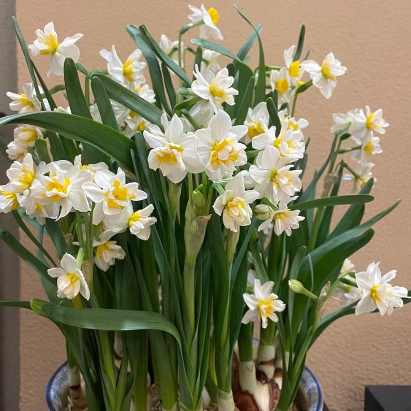 水仙花以其潔白的花瓣和清新的香氣而著稱,因其諧音 “誰先發”,有發家致富的寓意。水仙在年節時期象征思念,也表團圓。快過年時水仙就會陸陸續續的開花,散發出春節特有的香氣。水仙喜溫暖,濕潤,水培,土培都可以。將花球放在水裏,靜等幾日發芽之後就可以放到有陽光的地方養護。