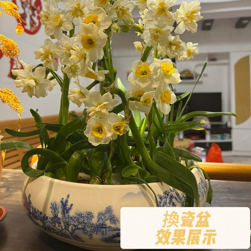 溫馨提示:水養的需要註意經常換水,,臟水容易讓水仙花球發爛。