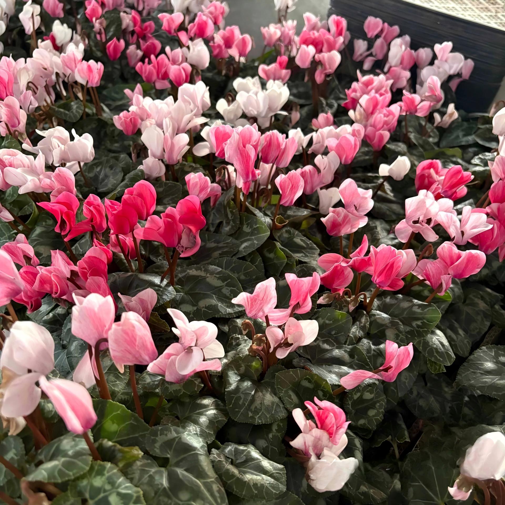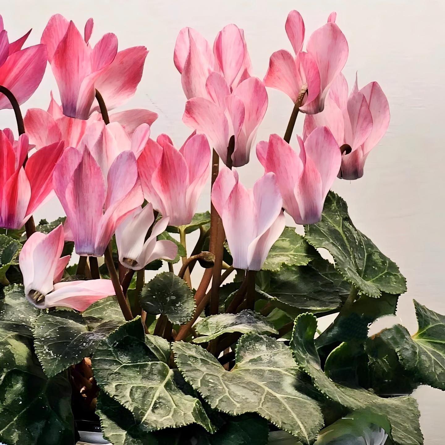 水彩色仙客來 Cyclamen 來是仙客來中極具藝術感的品種,花瓣色彩像被水彩暈染般自然過渡,從粉紅、桃紅到淡紫、奶白,每朵花像一幅小型畫作。花形輕盈優雅,花瓣微微上卷,如跳舞的裙擺,加上心形葉片與白色葉脈,整體觀感清新明亮,非常適合室內擺設、節日禮物或冬季觀花盆栽。
