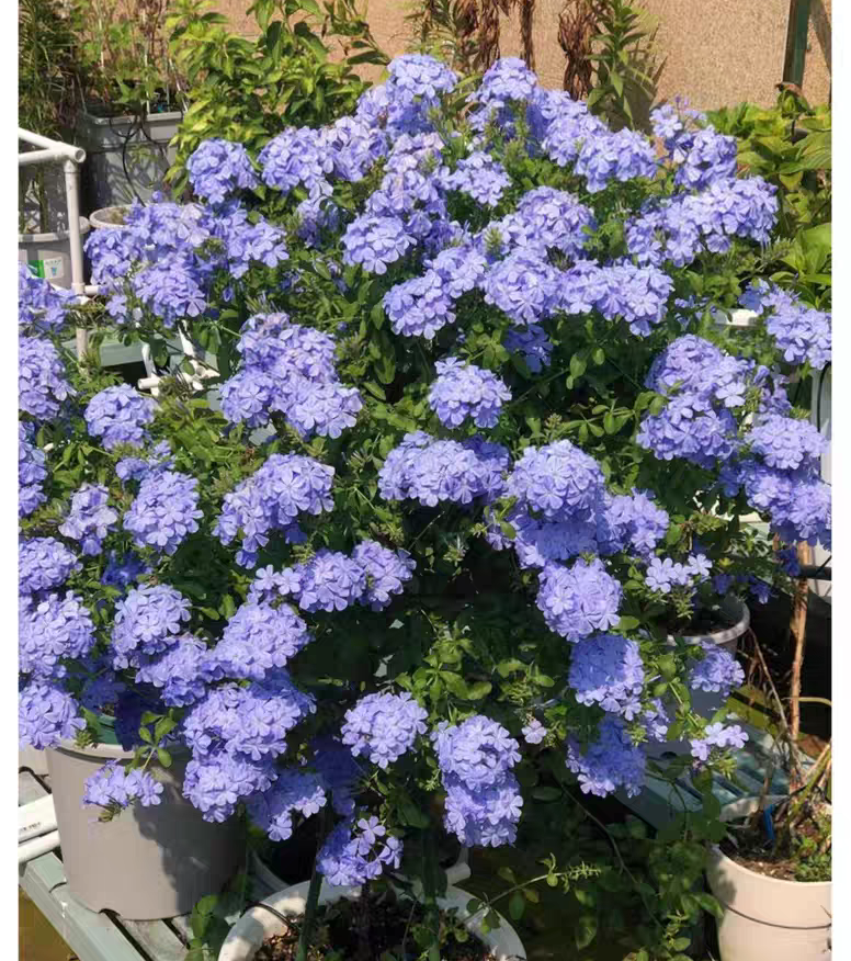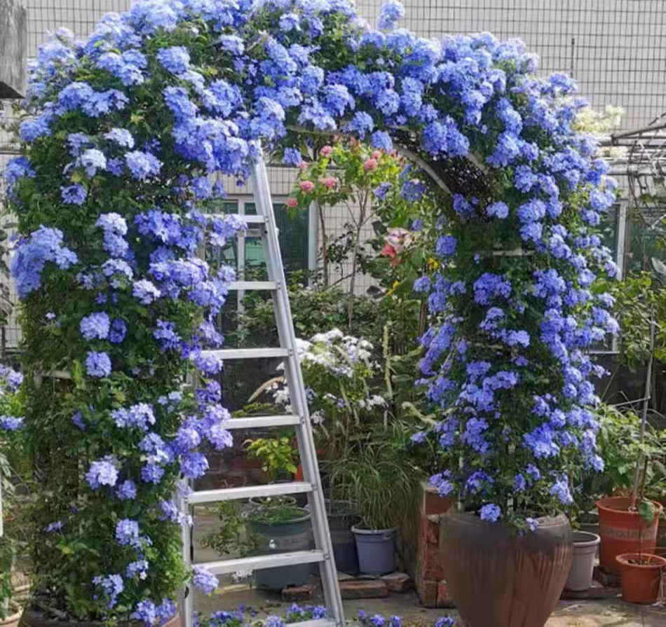 藍雪花(Plumbago auriculata)藍花丹藍茉莉 藍雪藤 攀爬花卉植物,又名藍花丹,藍茉莉 藍雪藤 .是一種常綠藤本灌木,攀爬花卉植物.以清新脫俗的天藍色花朵著稱。花期長,自春至秋不斷綻放,花序密集,形似雪花覆蓋枝頭,故有「藍雪花」之美名。其生長迅速,枝條柔軟易於牽引,是庭園、陽台與花牆造景的理想選擇。