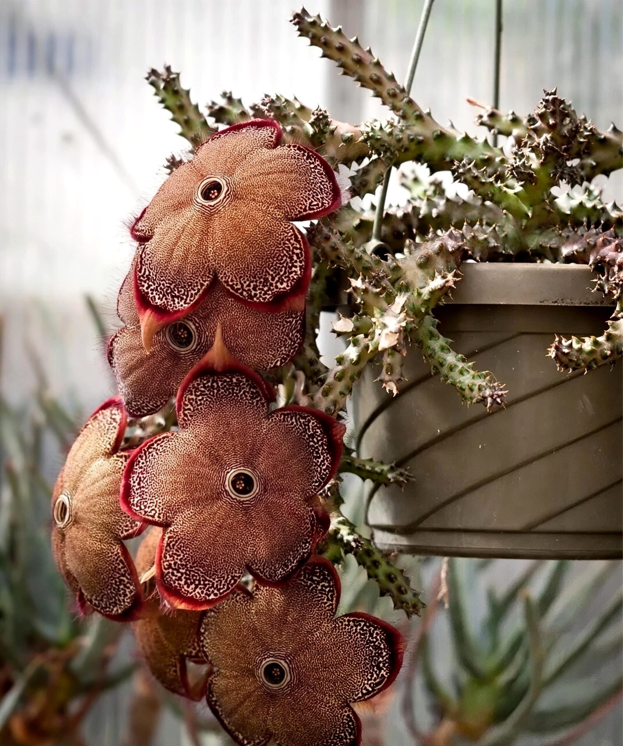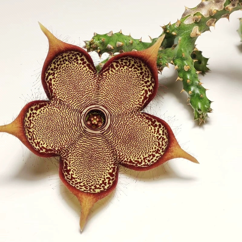 豹皮花(Stapelia grandiflora)又称“海星花”, “臭肉花”, “大花犀角”,属于萝藦科的奇趣多肉植物。 其最大特色为巨大的星状花朵,花瓣表面覆有浓密绒毛,带有独特的腐肉味,吸引传粉昆虫(主要是苍蝇)。 其花色斑驳似豹纹,植株茎节粗壮,呈四棱柱状,造型极具异国风情与收藏价值。