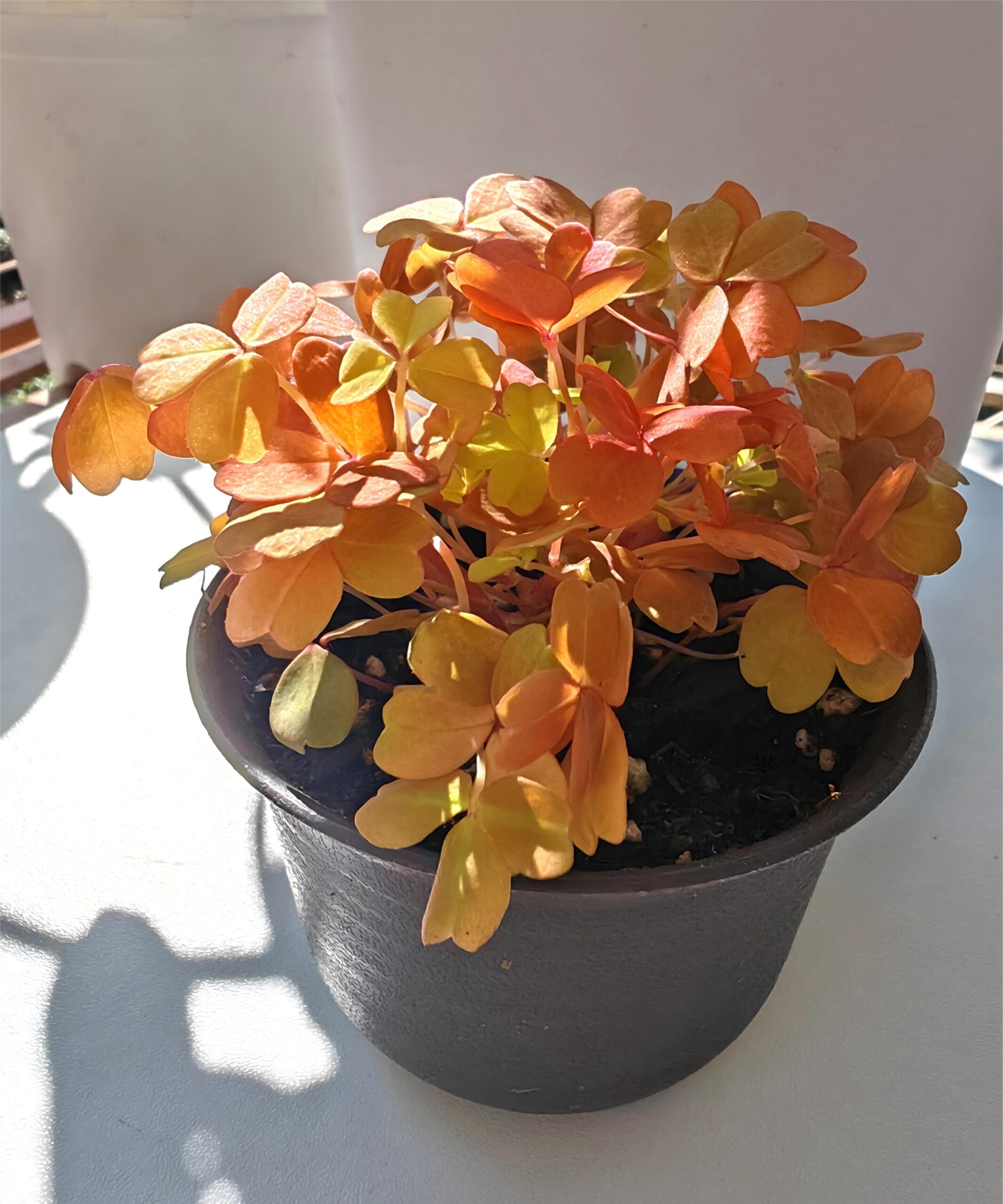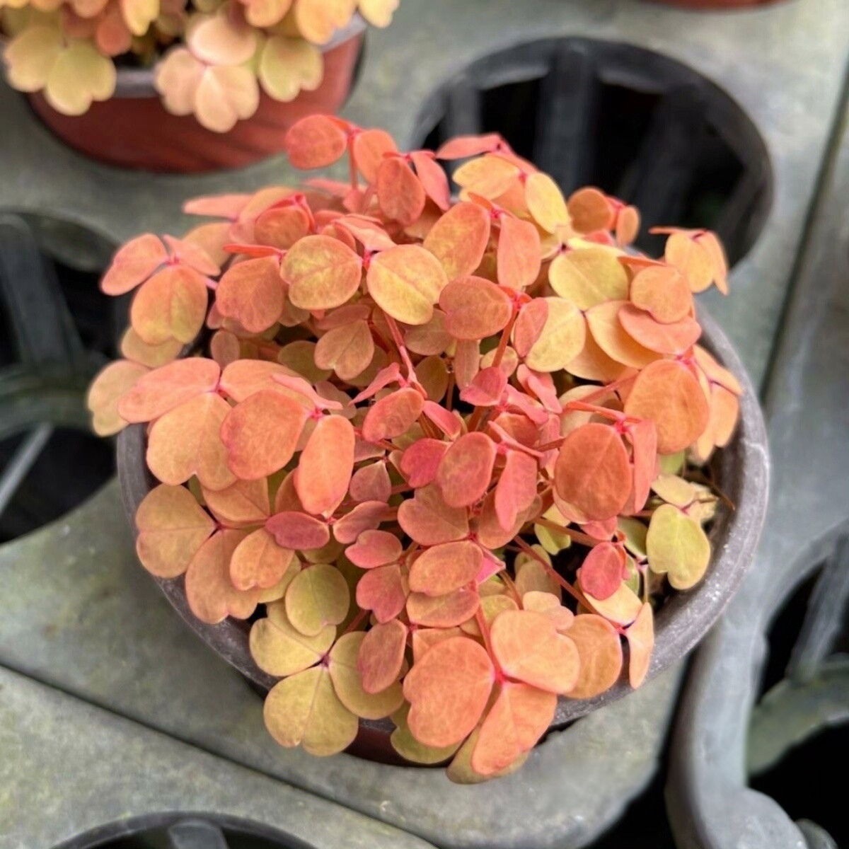 It grows best in bright, indirect light. Under good lighting, the leaf color becomes richer and more vibrant. In lower light, the foliage shifts toward softer red or greenish tones. The plant prefers lightly moist soil and good drainage. Avoid waterlogging to keep the roots healthy. With proper care, Oxalis ‘Sunset Velvet’ produces small pink or white flowers, adding a delicate contrast to its bold foliage.