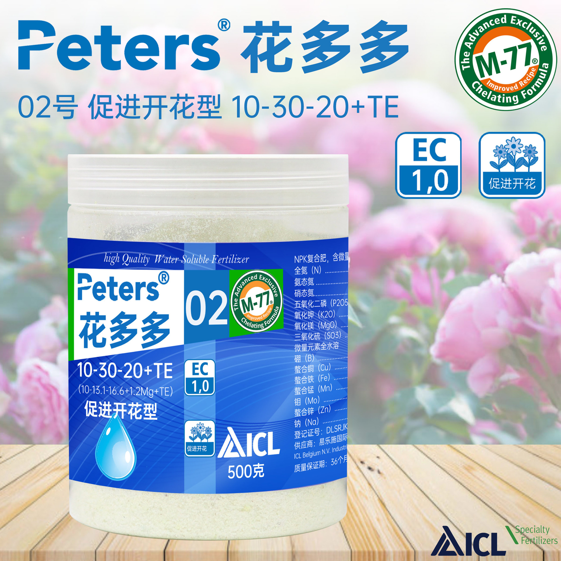 產品特性: 氮磷鉀比例1 :3 : 2(10 : 30 : 20)的比例能有效地促進花芽分化,使花苞壯碩及增加開花數量。於開花前、後使用可促進植物開花,防止落花落果,改善果實的品質。亦可有效抑制植物徒長,曾豔花色、增大花徑,強健植物。 建議使用: 本產品可用於葉面噴施,也可以土壤灌注。需先用水稀釋後使用(噴灑稀釋1000倍,灌注稀釋800倍),噴施時宜全株噴灑,每隔7-10天噴灑一次。長期使用高磷肥料會導致土壤中有過量磷而降低微量元素的有效性,所以建議搭配花多多1號輪替使用。