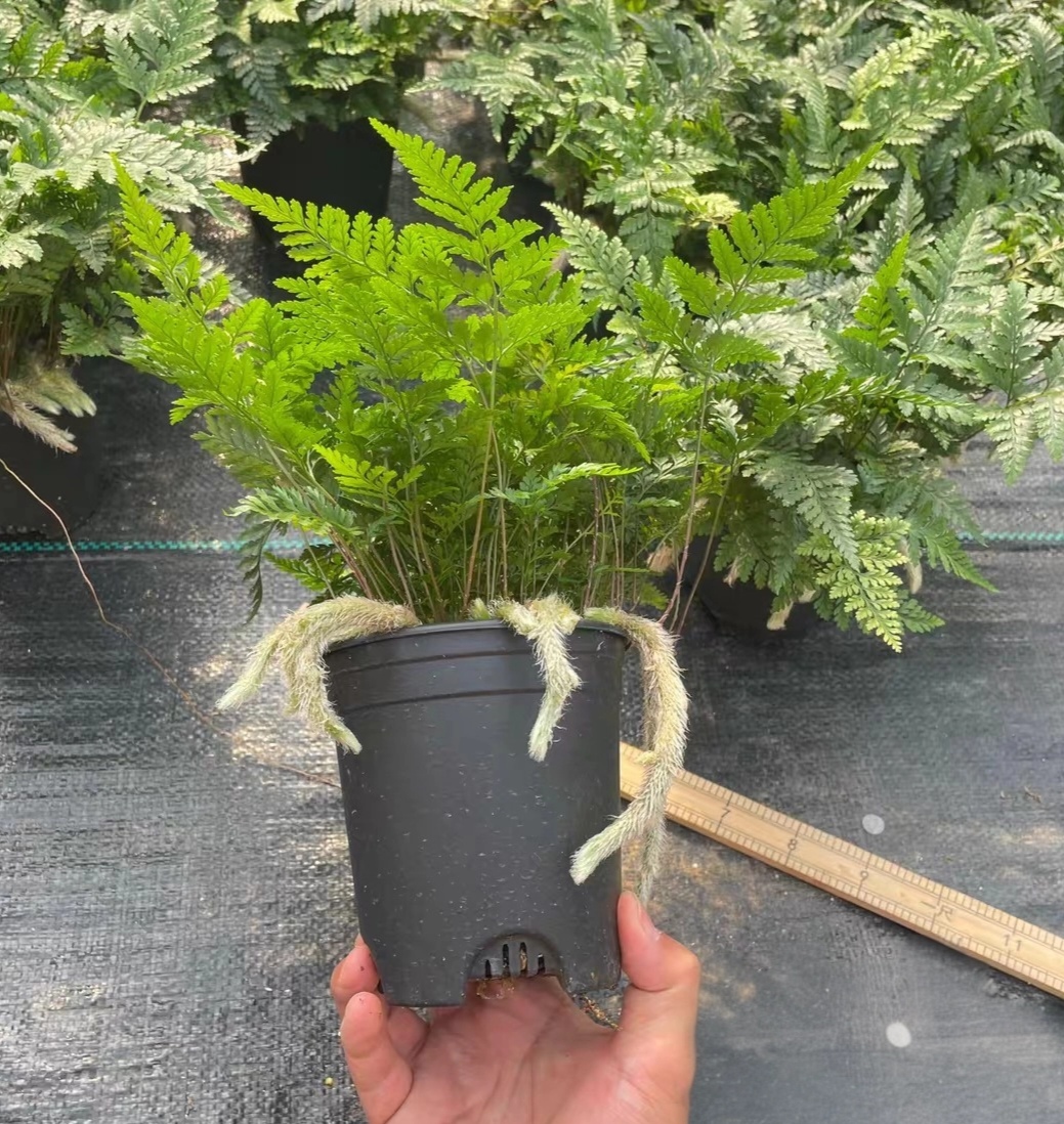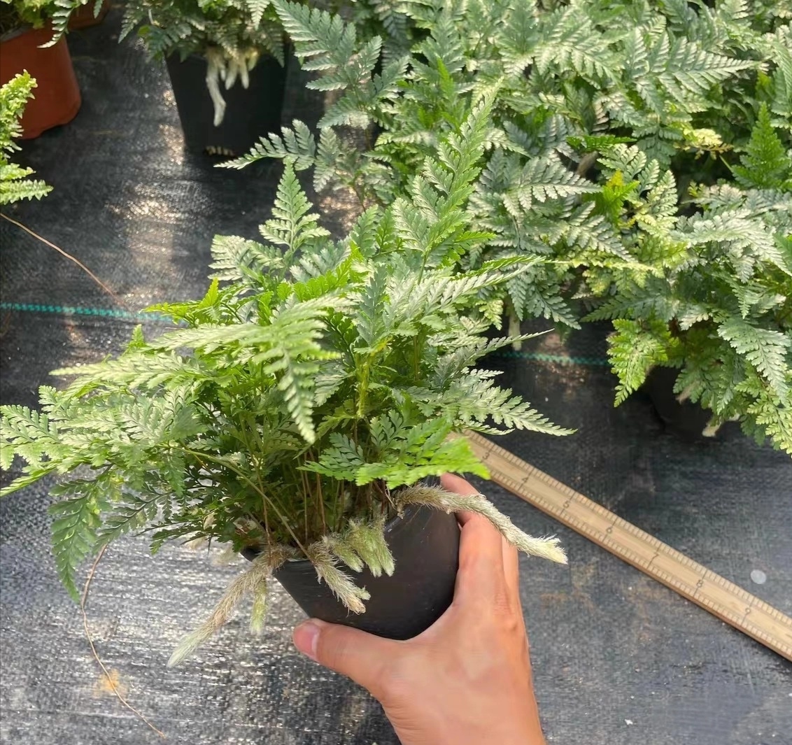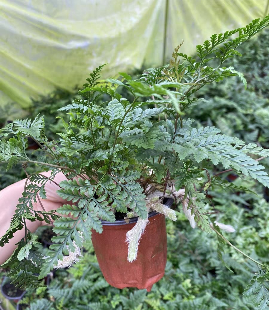 描述: 杯蓋陰石蕨(Humata griffithiana),又名“兔腳蕨”(Rabbit’s Foot Fern),是一種獨特且受歡迎的蕨類植物,屬於石蕨科(Davalliaceae)。其特點是地下根莖發展出像兔腳般的根塊,這些根塊呈現毛茸茸的外觀,為植物增添了觀賞價值。葉片為羽狀,通常呈深綠色,葉緣有細緻的鋸齒。